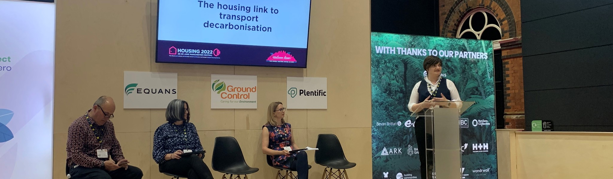 What does the climate emergency mean for transport and housing? The Unlock Net Zero stage at the CIH Housing Exhibition explored this on stage as Grace Carroll (Head of home, workplace, and destination EV charging policy, Office for Zero Emission Vehicles), Derek Watters (Head of environmental sustainability, Places for people), Rachel Toms (Director of urbanism, Sustrans) and Cllr Helen Hayden (Leeds City Council) discussed “The housing link to transport decarbonization”.